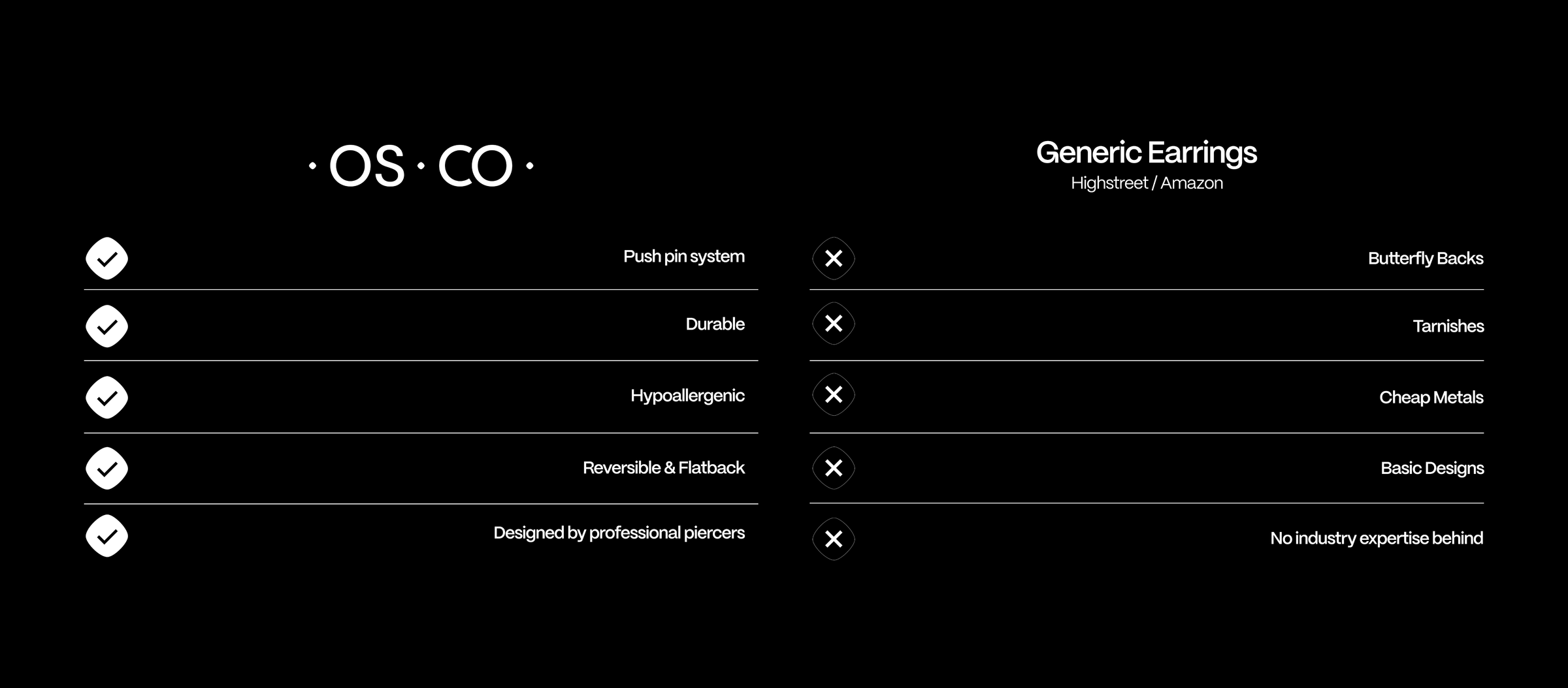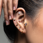 All earrings are implant-grade titanium or titanium with a premium PVD gold coating. No nickel, no brass, no cheap base metals. Safe for sensitive skin and everyday wear.